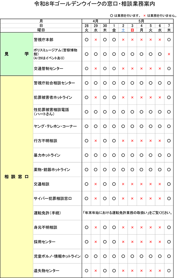 警視庁総合相談センター、犯罪被害者ホットライン、性犯罪被害者相談、ヤングテレホン、行方不明相談、暴力ホットライン、銃器・薬物ホットライン、交通相談、サイバー犯罪相談窓口