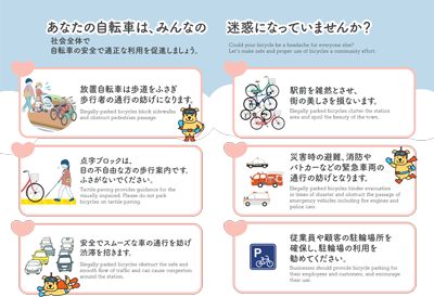 - 災害発生時には、放置自転車等が避難路を塞ぎ、救出救助活動に支障を来すなど、被害の拡大を招くおそれがあります。