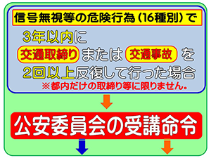 - 信号無視の交通取締りを受け、その後3年以内に信号無視が原因となる交通事故で警察官から取扱を受けた場合