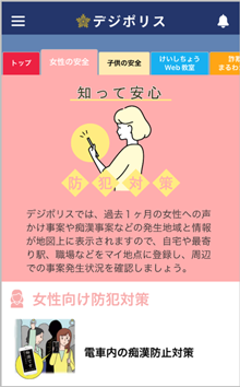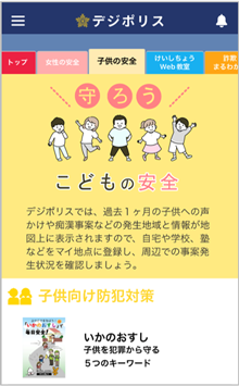 - 地図上に過去1か月の不審者情報などを地域別に色分け表示(画面をタップすると詳細が表示されます)