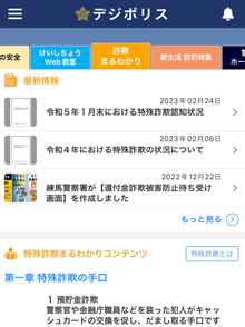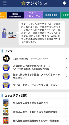 マイエリアの犯罪発生状況を表示し、「最新のメールけいしちょう」「最新のアポ電情報」「X(旧Twitter)」「最新情報(お知らせ)」がリアルタイムに配信されます。