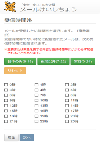 6時、7時、8時、9時、10時、11時、12時、13時、14時、15時、16時、17時、18時、19時、20時を選択します。(登録時は、個別に選択するほか、日中のみ9時から18時、夜間以外7時から22時、常時0時から24時の選択もできます。)